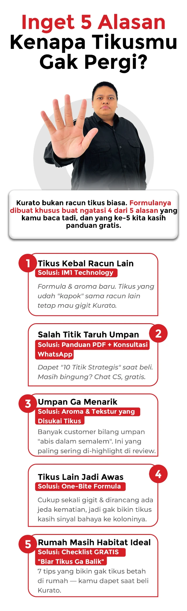 Kurato pakai IM1 Technology — formula + aroma berbeda dari racun umum. Ini khusus buat tikus yang udah "trauma" sama racun lain. Banyak customer kami yang sebelumnya nyerah sama 3-4 merek lain.